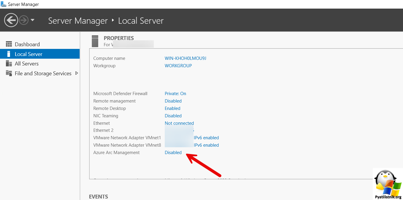 Запустив оснастку Server Manager и перейдя на вкладку "Local Server" вы можете увидеть пункт Azure Arc Management со статусом "Disable".