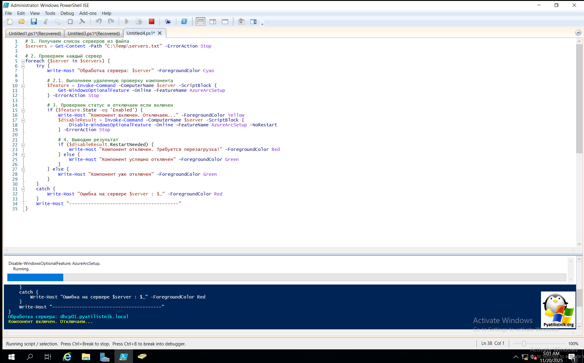 Если вам необходимо выполнить удаление компонента AzureArcSetup для многих серверов, то можно взять такой скрипт, единственное заполните текстовый файл вашими именами серверов в формате FQDN. В PowerShell ISE запущенном в режиме администратора выполняем: