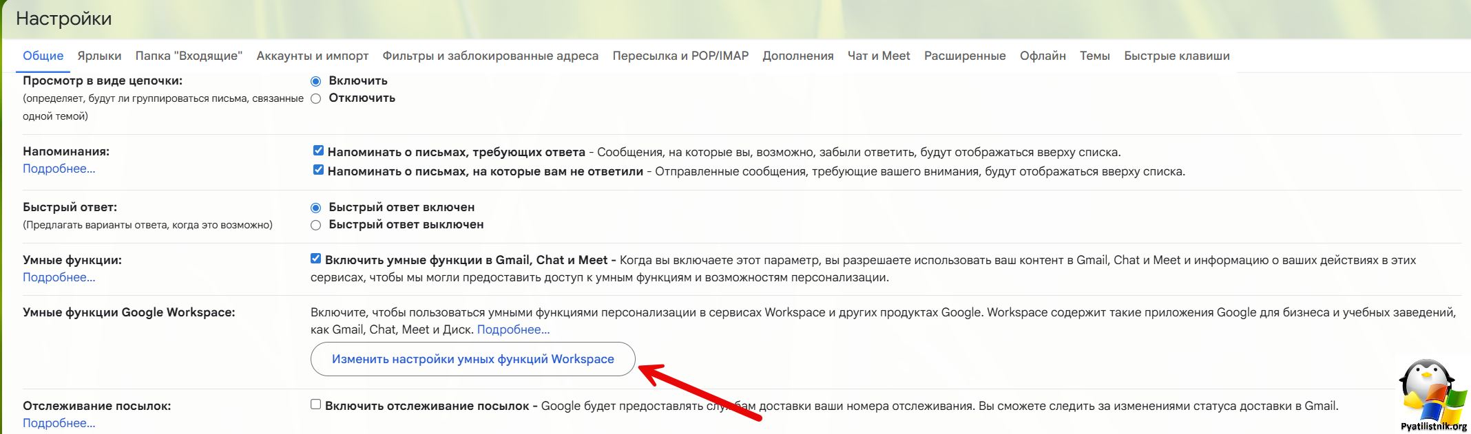 На вкладке "Общие" найдите раздел "Умные функции Google Workspace". Нажмите на кнопку "Изменить настройки умных функций Workspace".
