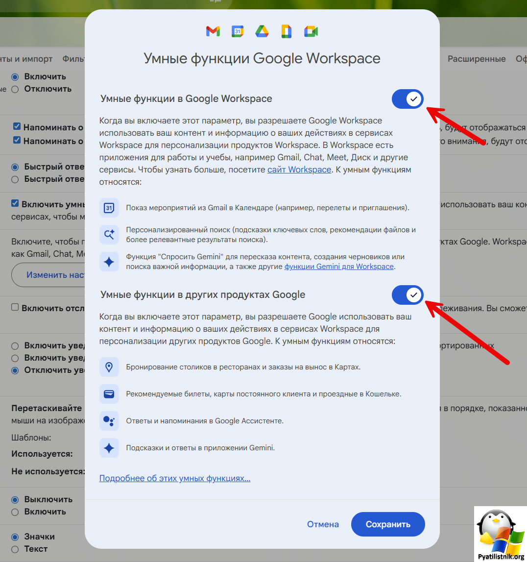 Добрый день! Уважаемые подписчики. Искусственный интеллект развивается с каждым днем и все больше проникает в различные продукты. Компания Google тут не исключение, если вы используете ее почтовый сервис Gmail, то там по умолчанию стали активны две настройки "Smart Features" и "Workspace Smart Features", которые разрешают использование ваших писем, файлов в продуктах экосистемы Google Workspace. Ниже я покажу, где отключить данную настройку, если она вам ненужна и вы не хотите чтобы ваши данные из Gmail как-то вышли за пределы почтового сервиса.