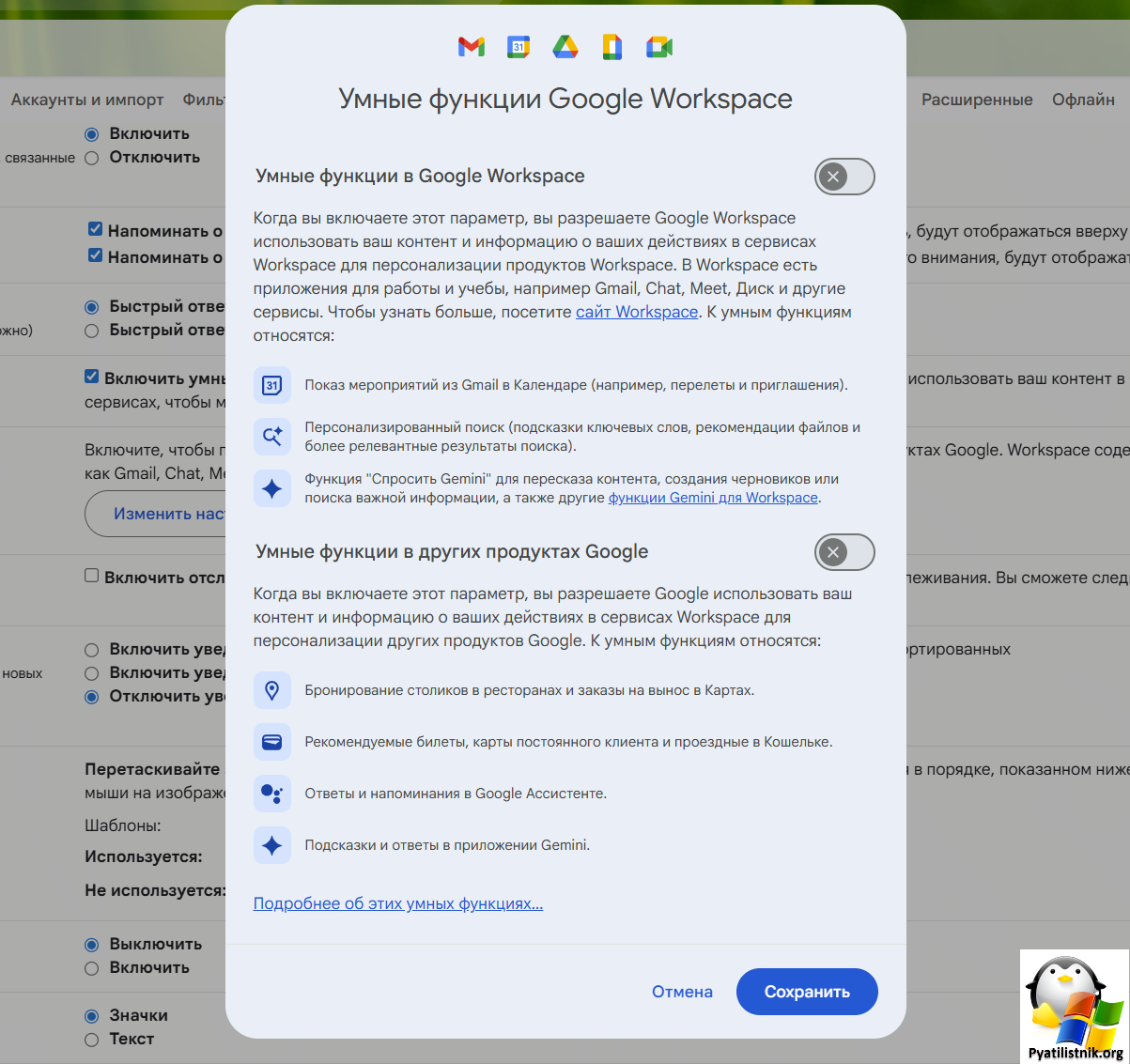 Теперь когда ползунки переведены в неактивное состояние, Google нас уверяет, что AI не будет использовать ваши письма Gmail сам и в других сервисах экосистемы Google Workspace.