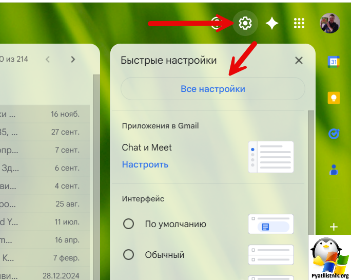 Поэтому если есть явная возможность поставить галочку, чтобы это отключить я это сделаю. Переходим в интерфейс Gmail. В правом верхнем углу нажмите изображение шестеренки⚙️ и нажмите на пункт "Все настройки".