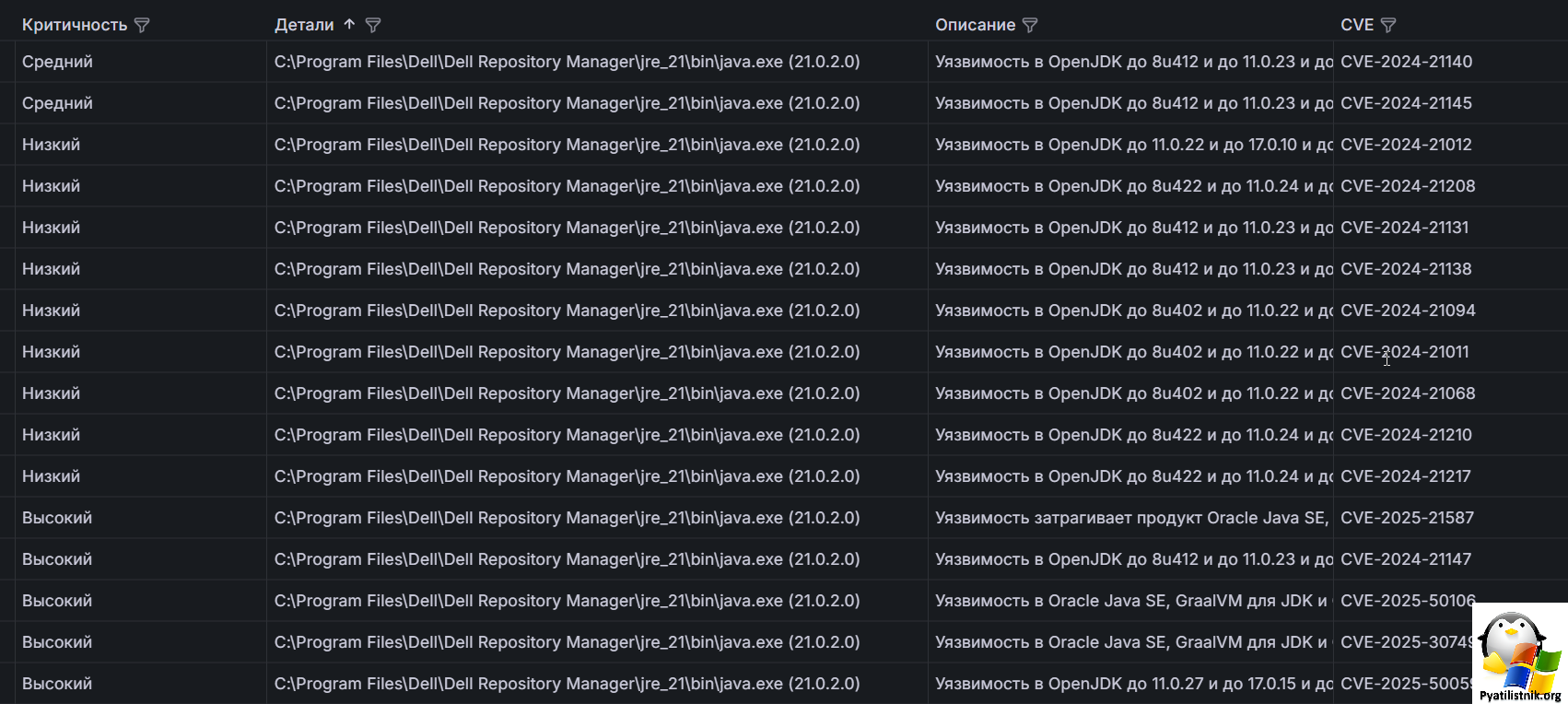 Но если посмотреть отчет по уязвимостям, я это делаю в Grafana, то я вижу что программа имеет старую версию Java.exe.