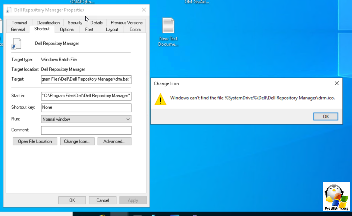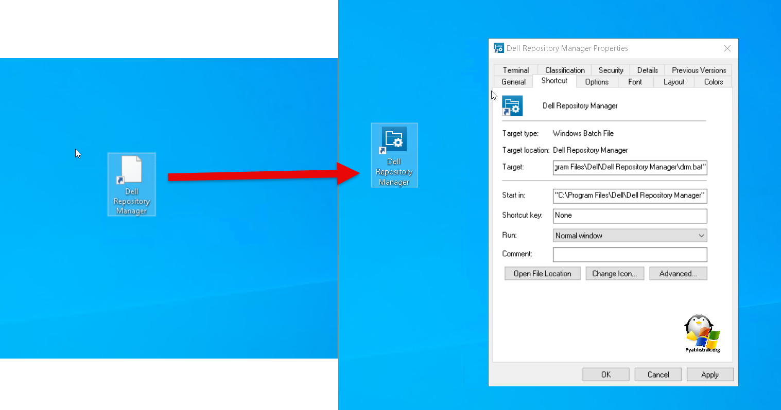 - В поле "Target" - "C:\Program Files\Dell\Dell Repository Manager\drm.bat"